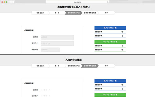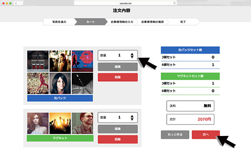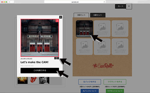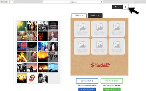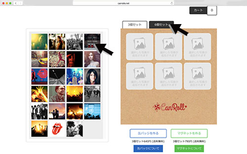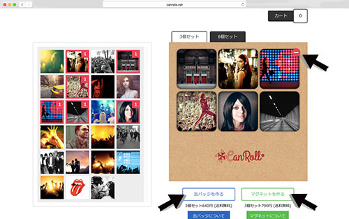 選び終えたら、「缶バッジ」か「マグネット」を選択してください。